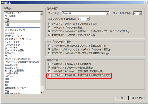 [ハイライト、取り消し線、下線のテキスト選択を有効にする]のチェックを外す。※下図の赤枠部分