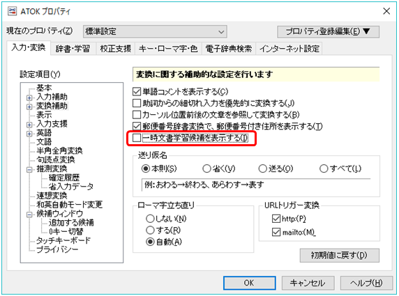 [一時文書学習候補を表示する]のチェックを外す。※下図の赤枠部分
